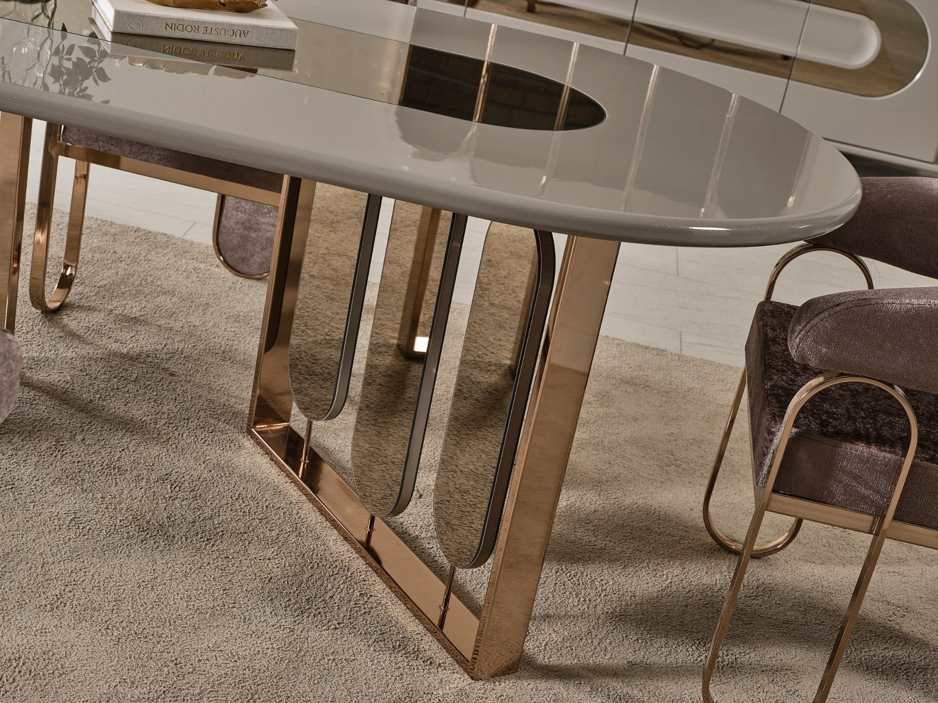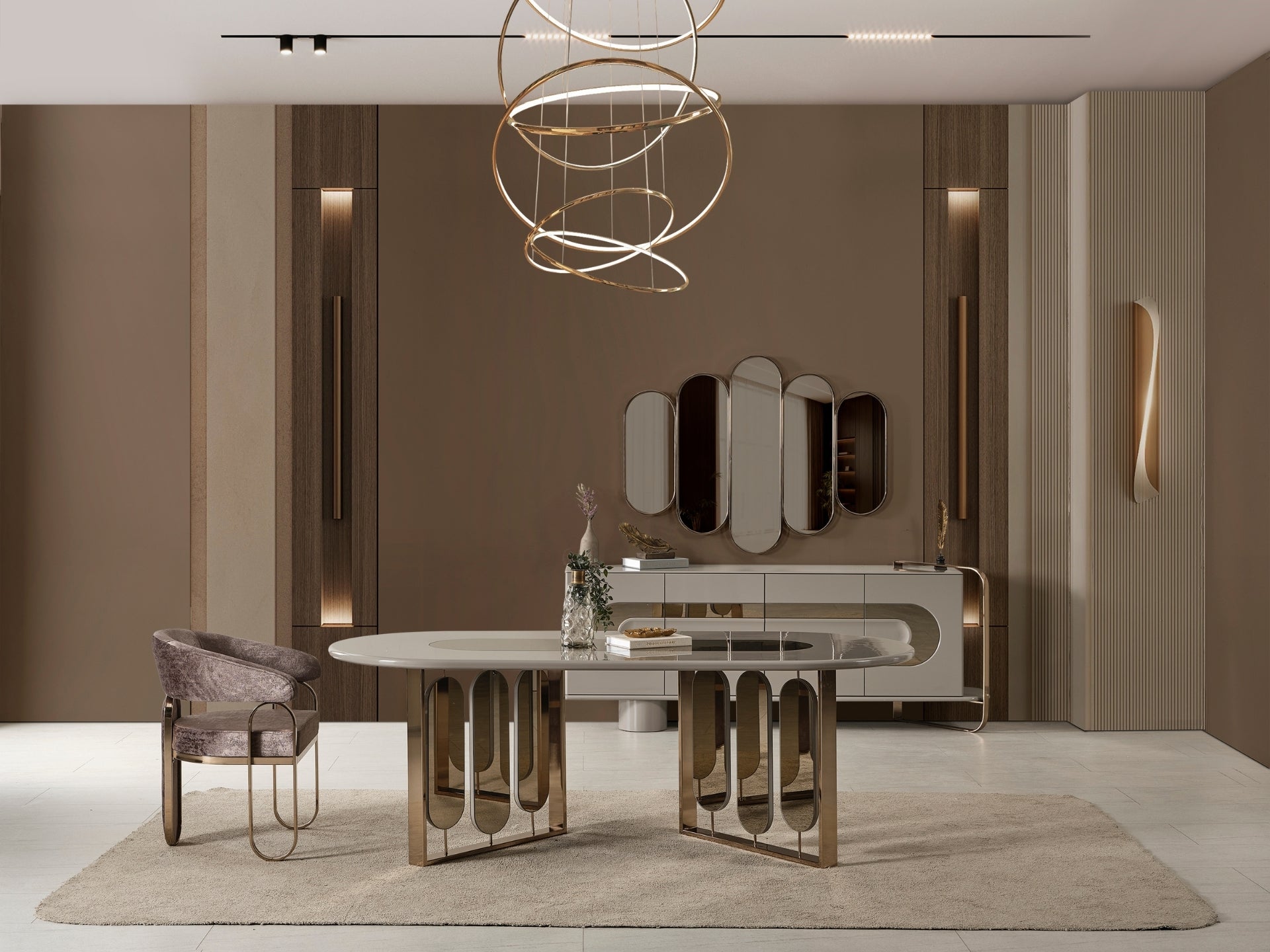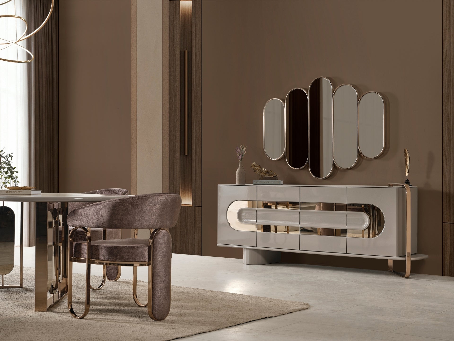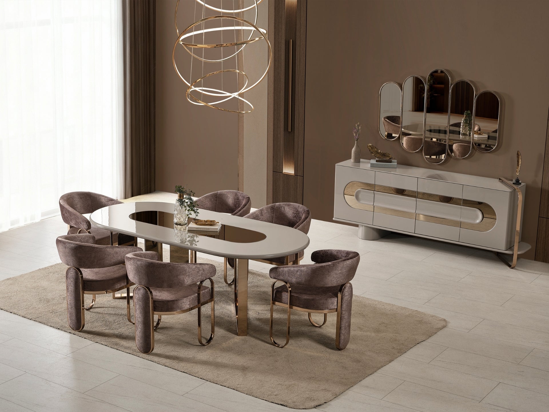 Liora Yemek Odası; oval yemek masası, gold metal detaylı sandalyeler, geniş konsol ve dekoratif ayna ile modern lüks bir stil sunar. Düzenli ve ferah bir yemek alanı için ideal.