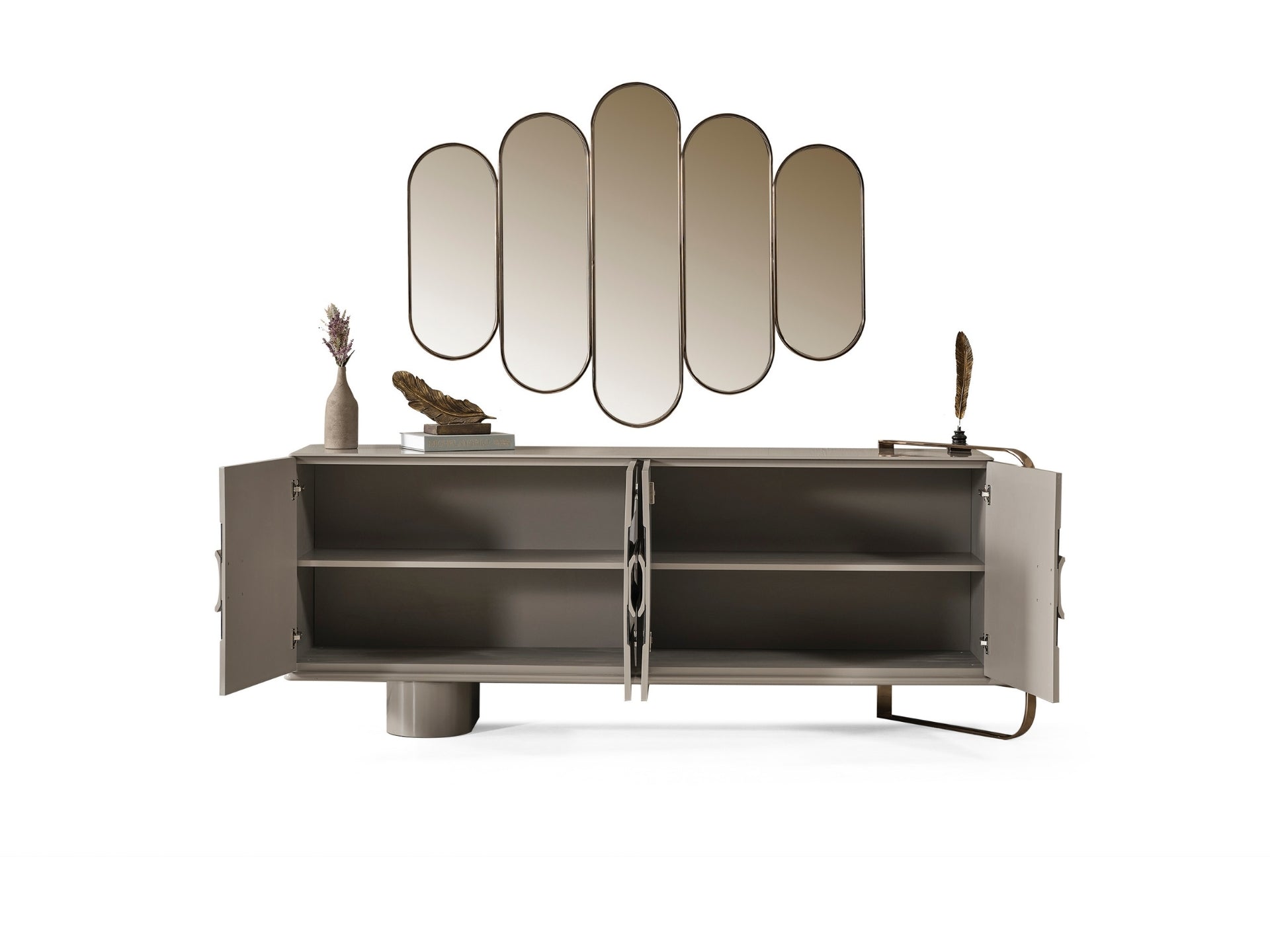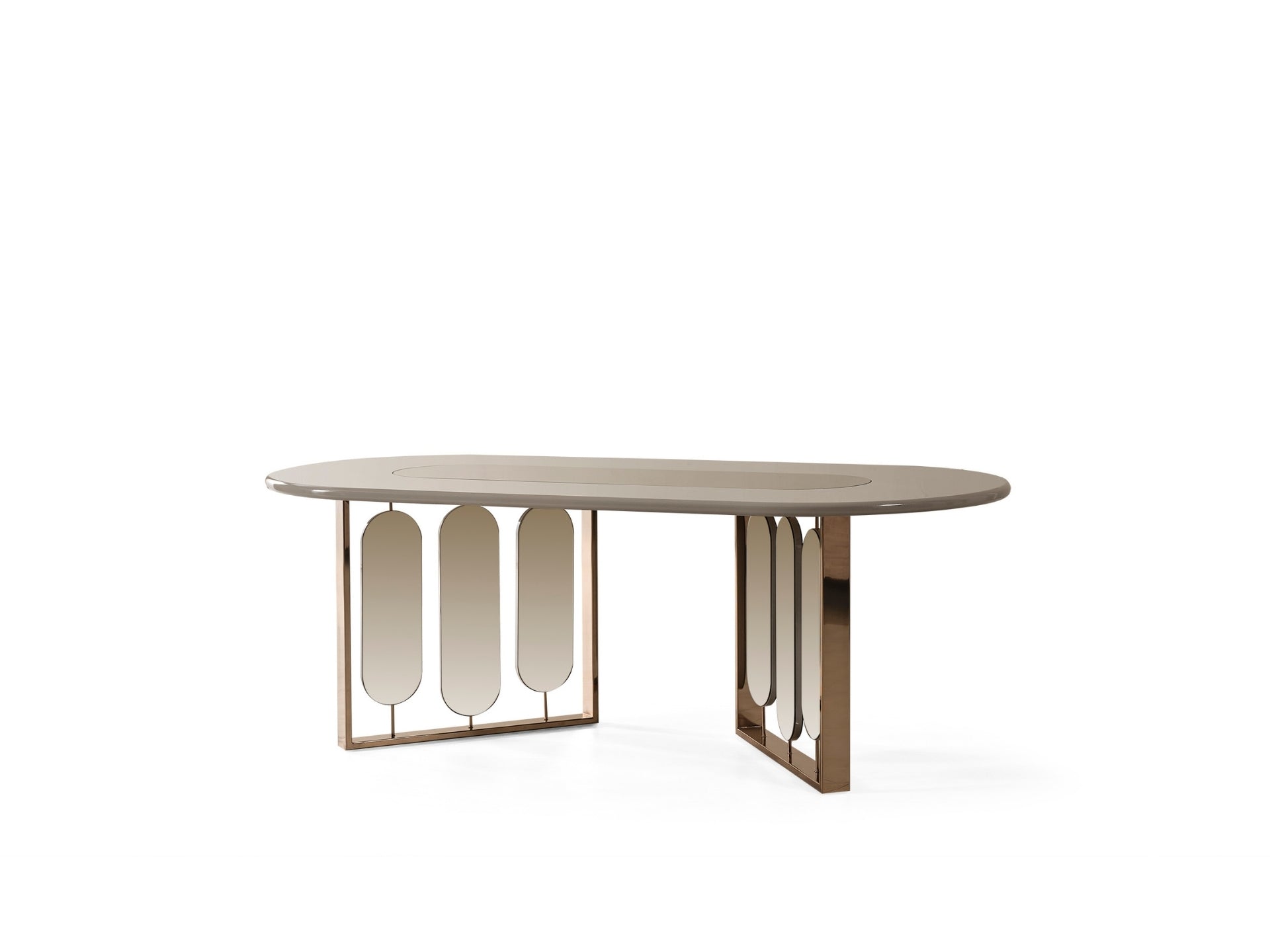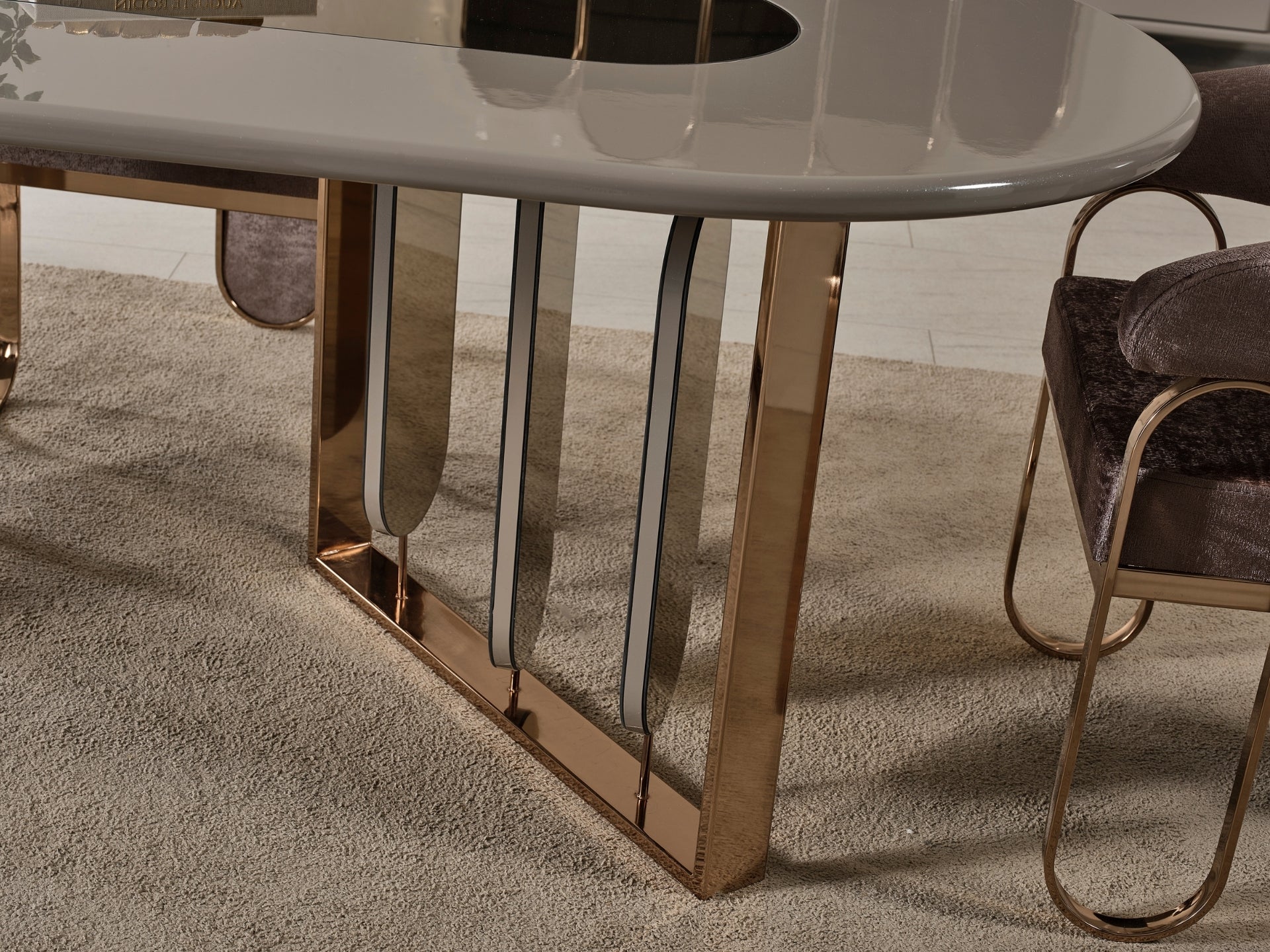 Liora Yemek Odası; oval yemek masası, gold metal detaylı sandalyeler, geniş konsol ve dekoratif ayna ile modern lüks bir stil sunar. Düzenli ve ferah bir yemek alanı için ideal.