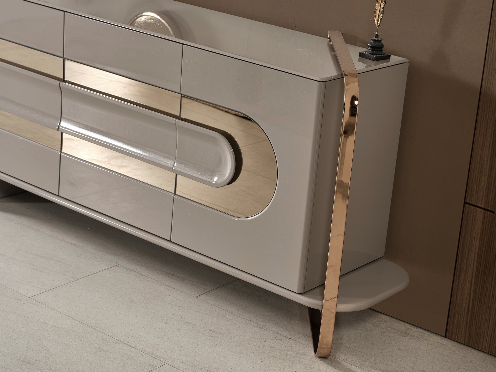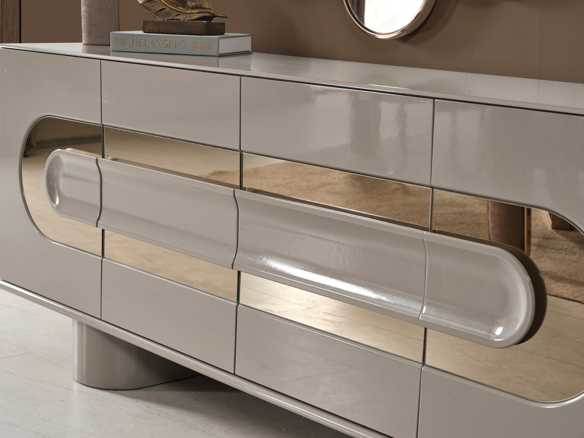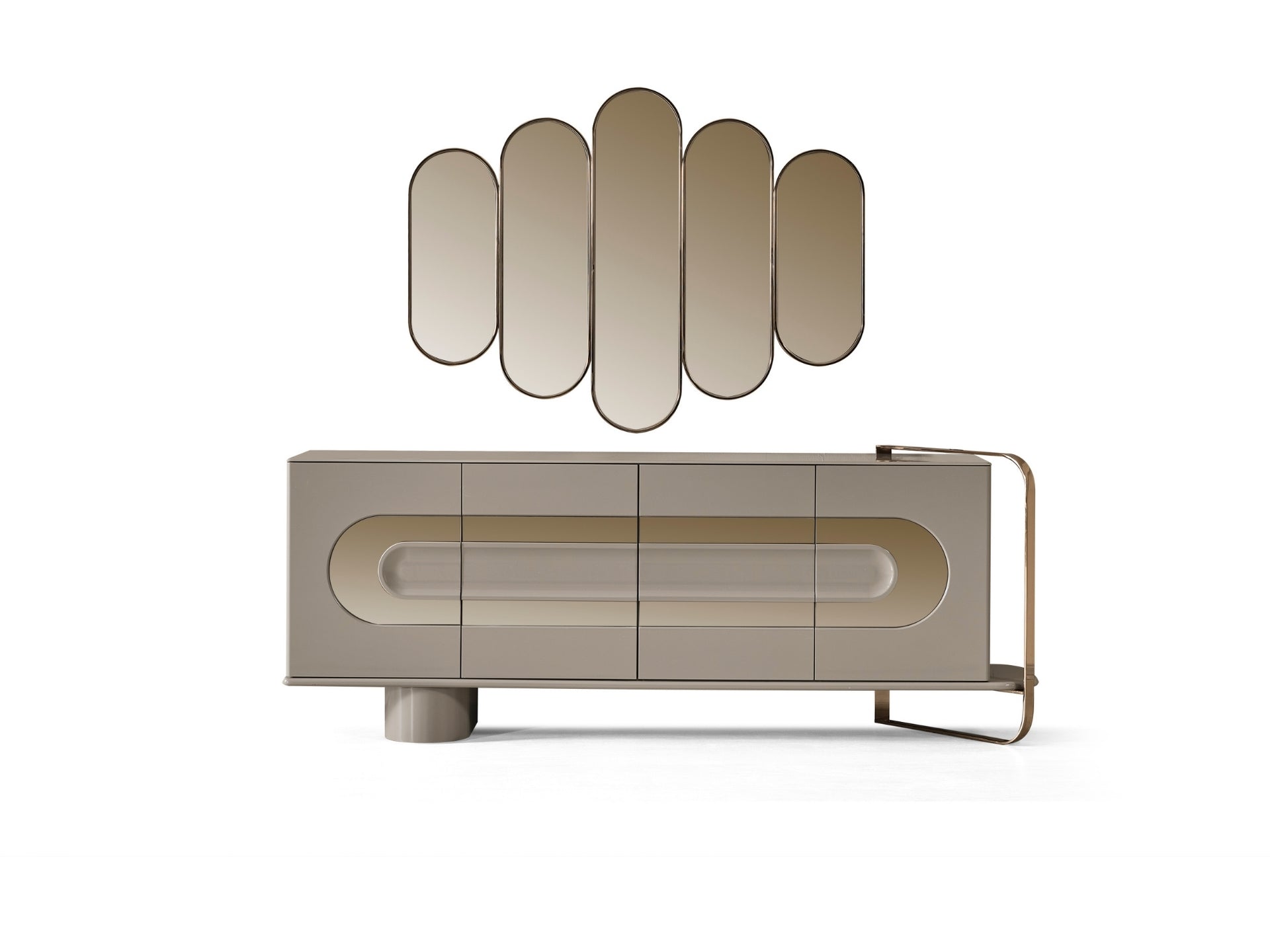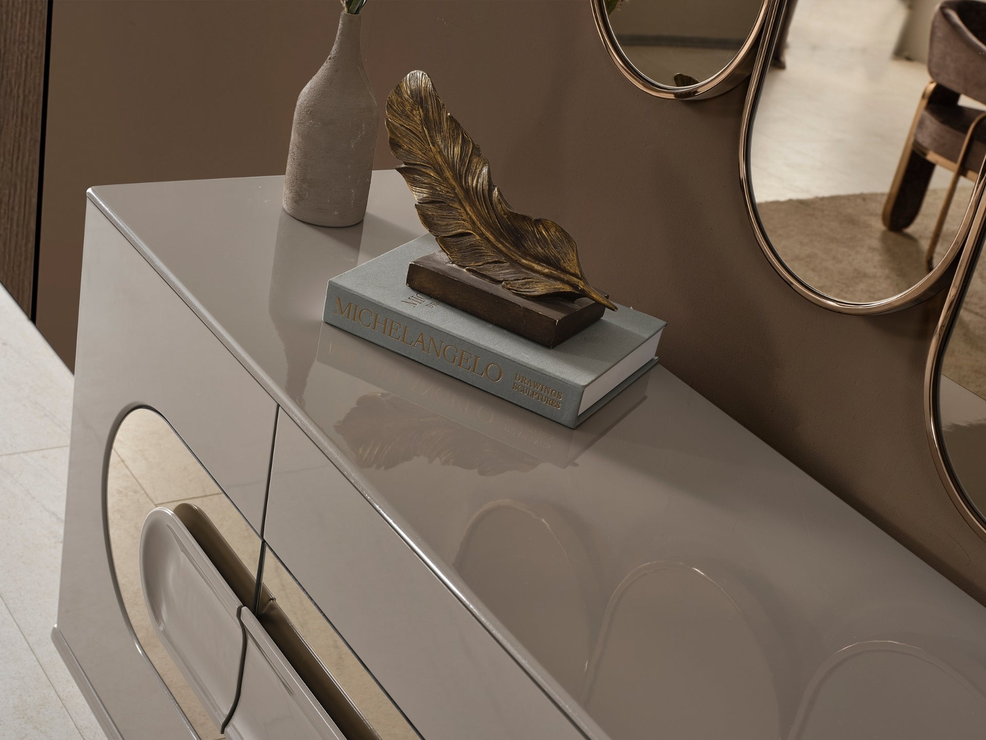 Liora Yemek Odası; oval yemek masası, gold metal detaylı sandalyeler, geniş konsol ve dekoratif ayna ile modern lüks bir stil sunar. Düzenli ve ferah bir yemek alanı için ideal.